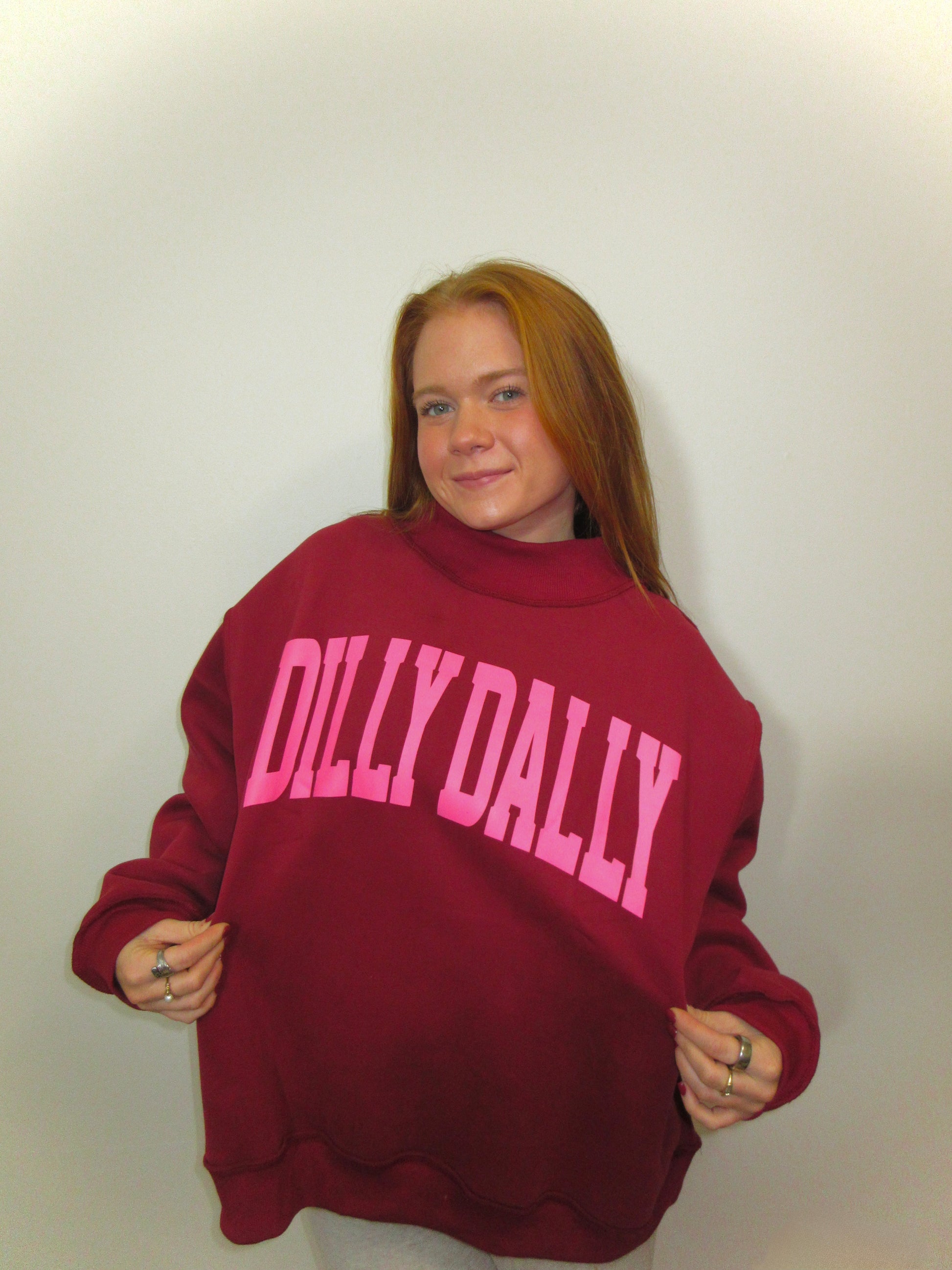 Slow down in style with our "Dilly Dally" Reversible Mockneck! This ultra-soft, oversized fleece features a bold pink graphic on one side and a clean, no-print look on the reverse — two cozy vibes in one. Designed with a mock neck, drop shoulders, and ribbed trims for that perfectly relaxed fit.